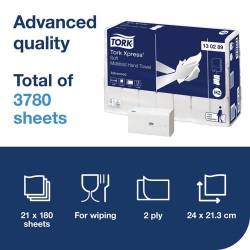 Provide a quality hand drying experience for your guests with these soft Tork Xpress Multifold Hand Towels Advanced. Gentle on the hands with a high quality feel. Suitable for the Xpress Multifold Hand Towel Dispenser. This large, 2-ply, embossed hand towel with great absorbency. One at a time dispensing for reduced consumption and increased hygiene. This pack contains 21 sleeves containing 180 white sheets. Each sheet measures W213 x 240mm (unfolded).