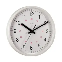 - Ideal for workplaces that operate outside of the normal 9-5 routine, the Acctim Metro 24 Hour Plastic Wall Clock (21202) features an inner 24 hour ring. The thick hands, easily readable from across a room, are powered by a precision quartz movement. The inner red 24 hour track lets you work out 24-hour time at a glance. The 355mm white dial is surrounded by a matching white plastic trim. A glass lens protects the clock face from damage or tampering.