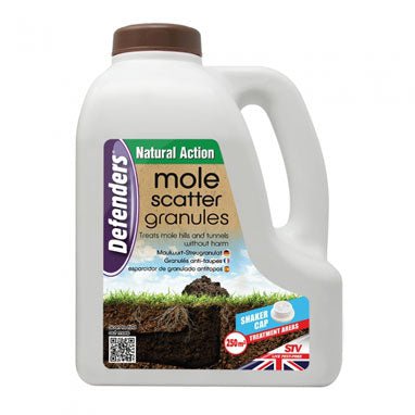 - Defenders Mole Scatter Granules 2. 5kg (STV653)Defenders Mole Scatter Granules 2. 5kg (STV653) Mole Scatter Granules from Defenders? combine natural plant oil extracts with biodegradable granules for the treatment of mole tunnels in vulnerable areas such as seed beds, lawns, meadows and parks. The plant oils penetrate down into the tunnels and surrounding earth, tainting the moles' food source and eliciting an oral repulsive response, encouraging them to find new feeding locations. Works as an aversive product. Treats mole hills and tunnels without harm.