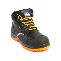 Fuel and oil resistant Himalayan 5402 waterproof black leather steel toe cap with orange sole and energy absorbing heel. These boots feature a breathable waterproof lining.