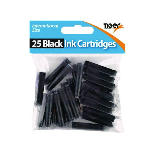 - Black Ink Cartridges, 12 packs of 25. The perfect way to keep pens writing, these ink cartridges are great quality and packed full of black ink, providing plenty of ink to sustain any writing needs. These black ink cartridges are international size.