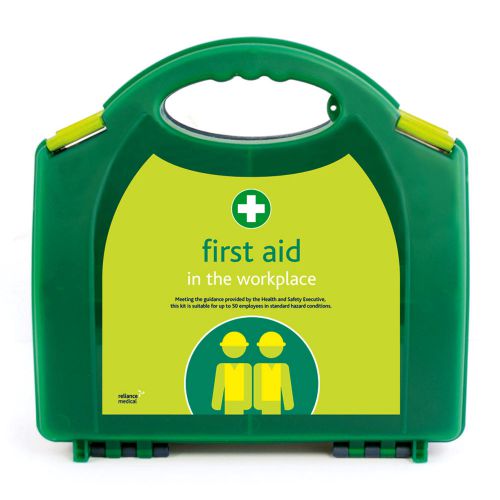 - Designed to meet the HSE First Aid requirements for workplaces with up to 50 employees. Packed into a durable polypropylene aura box with green safety clips, including integrated carry handle, and a secure airtight lid which provides protection from dust and water. All contents meet the Health & Safety Executive guidelines.