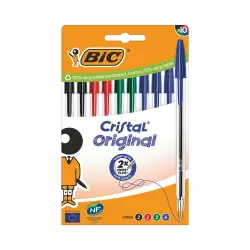 - These Bic Cristal Ballpoint Pens feature a durable tungsten carbide ball mechanism and smooth, instant drying ink for reliable, everyday use. The medium 1.0mm tip produces a thin 0.32mm line. The hexagonal barrel includes a coloured cap and end plug that matches the ink colour for easy identification. This pack contains 10 assorted pens in a recyclable cardboard box.