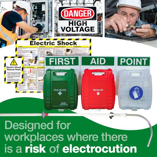| Includes a British Standard Compliant First Aid Kit, a Burn Stop Burns Kit, an Electric Shock Rescue Hook, Sign and Electric Shock Guidance Poster |